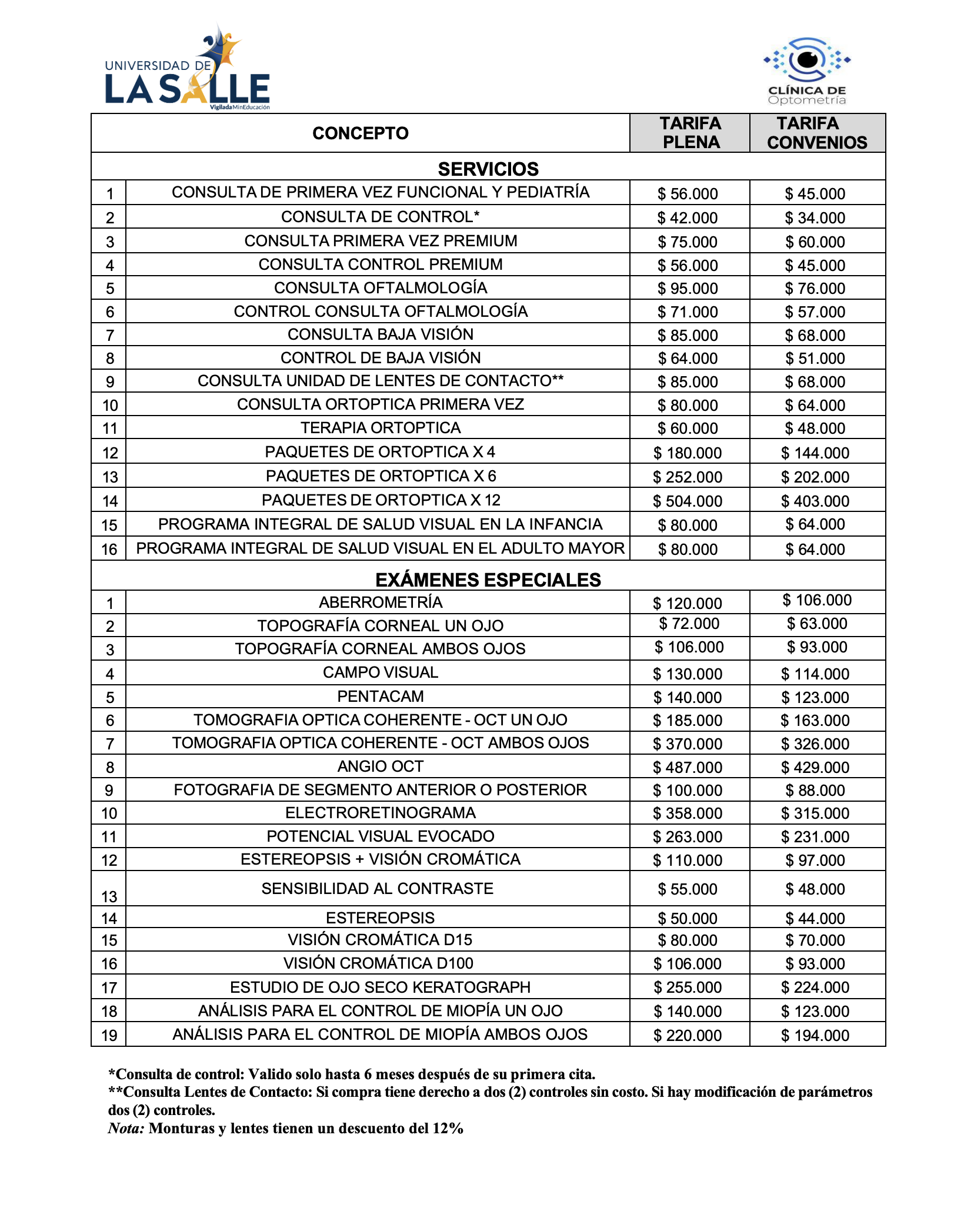 - 12% de descuento en monturas y lentes.